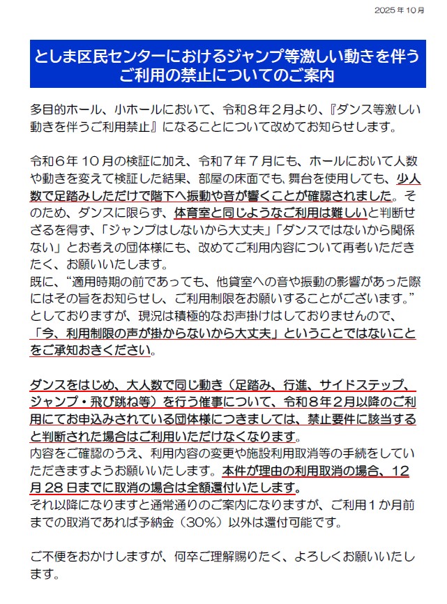 【返金対応12月28日まで】としま区民センターにおけるジャンプ等激しい動きを伴うご利用の禁止についてのご案内