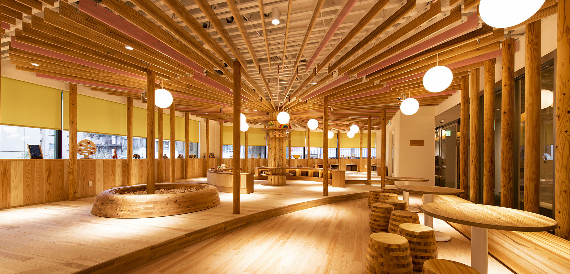 小さなお子様連れのお出かけをサポートするビルの中の1つの公園。木に囲まれた憩いの空間をお楽しみいただけます。