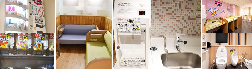 パパママ☆すぽっとの隣にあります、自動販売機(紙パック飲料・離乳食・おむつ)、おやこトイレ、オムツ替え台は、ご予約がない方もご利用になれます。
